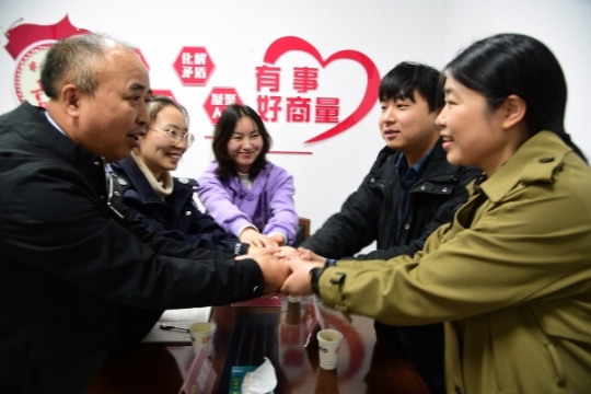 11月23日,山东省枣庄市市中区司法局龙山路司法所工作人员和人民调解员正在调解一起因邻里琐事引发的纠纷。