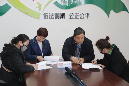 11月17日,河南省开封市宋都人民调解委员会调解员与律师联手化解一起纠纷,当事双方现场签订调解协议。