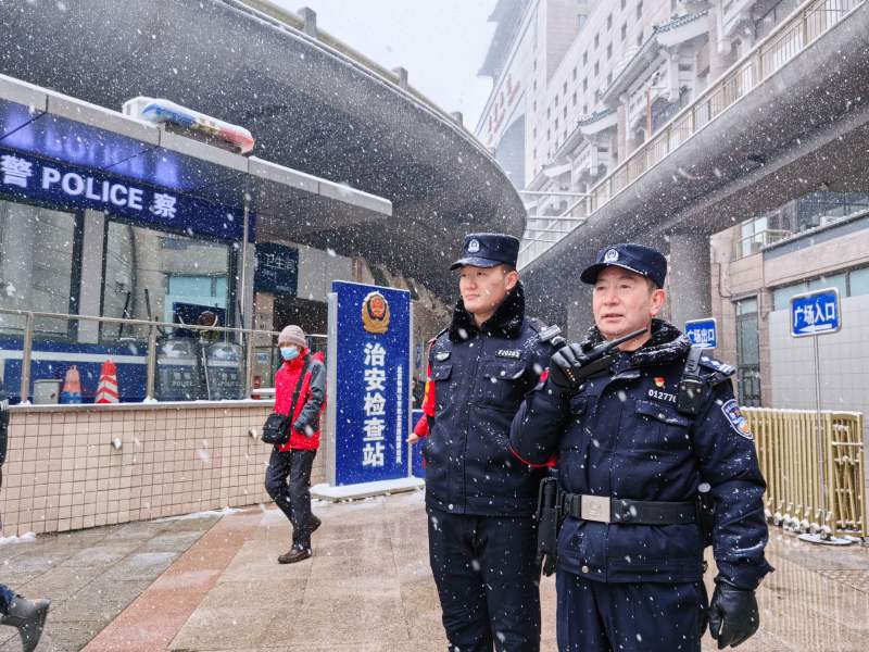 12月13日,北京出现强降雪天气,北京铁路公安处组织管内车站派出所加强站内客流疏导和秩序维护工作,并部署铁路沿线派出所加强巡逻巡视,排除安全隐患。图为民警在北京西站维护秩序。
