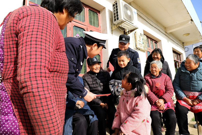 近日,安徽省舒城县公安局交管大队联合柏林派出所走进辖区柏林乡秦桥村,开展“一老一小”交通安全宣传,提高老年人、少年儿童的交通安全意识。图为民警向村民宣讲交通安全知识。
