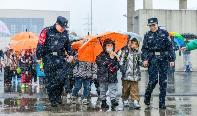 安徽马鞍山市和县公安局护学岗民警雪中护送学生放学