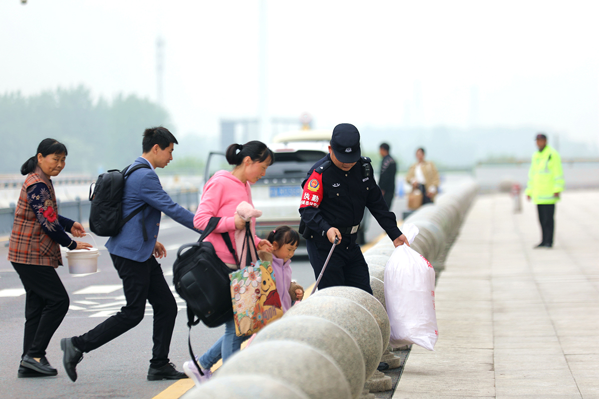 5月5日,安徽省舒城县公安局千人桥派出所联合高铁东站警务站民警辅警在入站口平台疏导交通、服务群众,确保返程旅客平安出行。图为执勤辅警帮助旅客快速通过车辆通道。