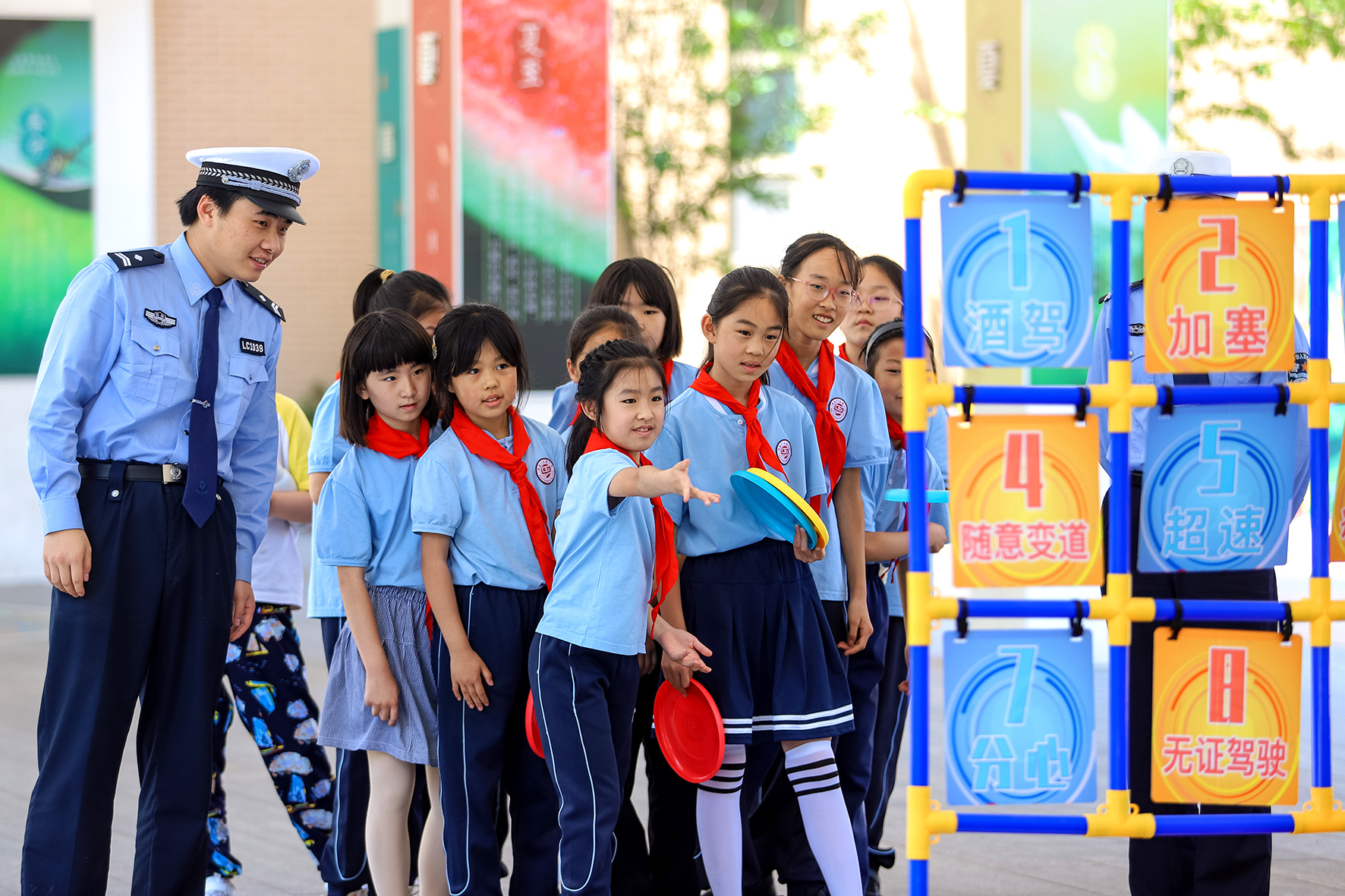5月29日,山东省青岛市公安局交通警察支队李沧大队民辅警来到广水路小学,举办“筑牢安全防线 共建平安校园”主题活动。图为学生通过飞盘游戏形式学习交通安全知识。