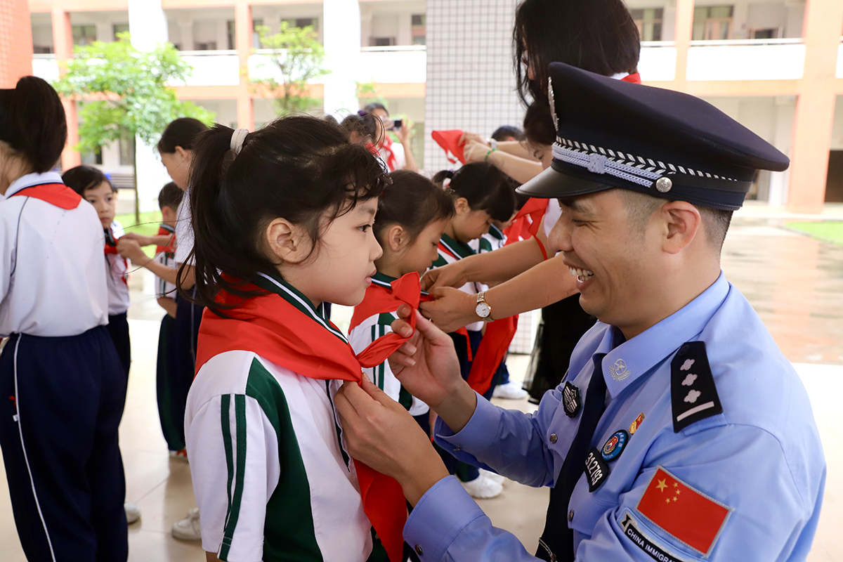 近日,珠海边检总站开平边检站组织民警来到开平市梁金山小学开展进校园活动,为学生们带来一堂生动的爱国主义教育课。图为开平边检站移民管理警察为新加入少先队的学生佩戴红领巾。