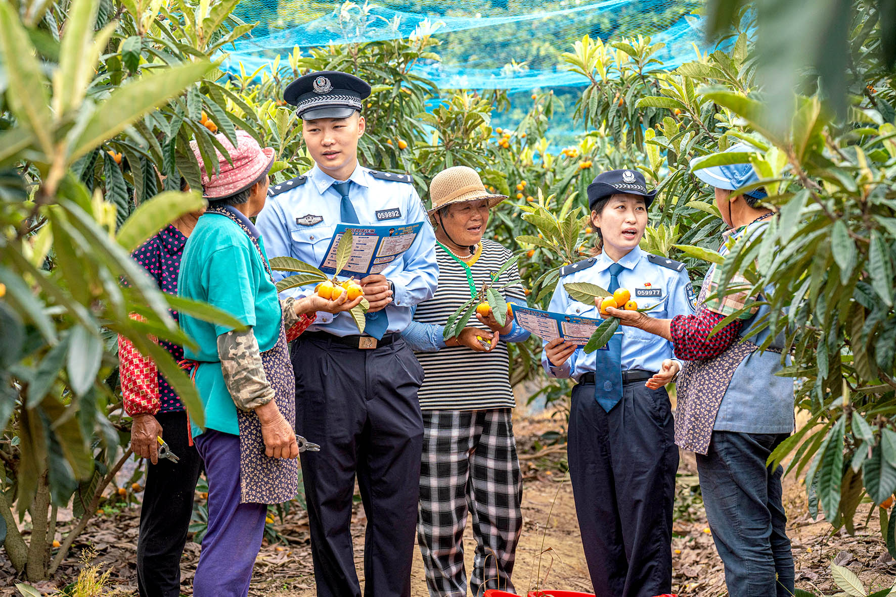 近日,上海市公安局崇明分局绿华派出所民警来到辖区果园开展法律宣讲和助农服务,提升农户法律意识。图为民警向果农们开展电信网络诈骗防范宣传。