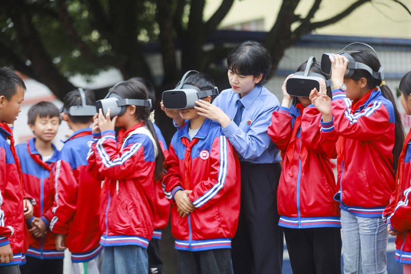 6月17日,贵州省黔西市人民检察院组织检察官走进辖区雨朵镇扯泥小学,开展禁毒主题宣传活动,通过展示毒品模型、发放宣传页、VR眼镜认识毒品危害等,向学生讲解新型毒品种类、特征和危害,提高学生识毒、拒毒、防毒意识。图为检察官指导小学生利用VR眼镜认识毒品的危害。