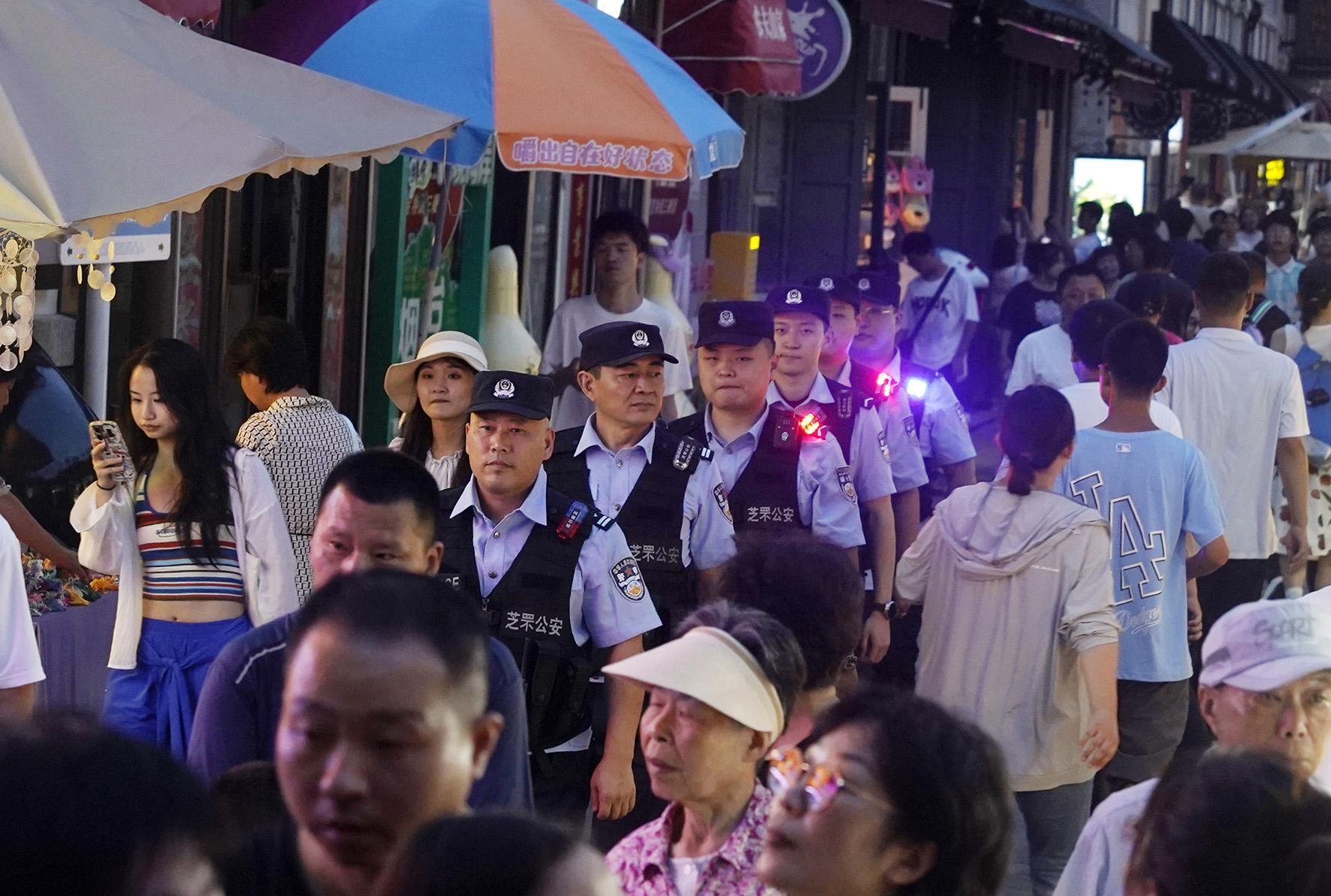 近日,山东省烟台市公安局开展夏夜治安巡查宣防第二次集中统一行动,组织警力加大对景区、车站等人员密集区域的检查和巡防力度,全力营造安全稳定的社会治安环境。图为烟台市公安局芝罘分局民警在朝阳街景区巡逻。