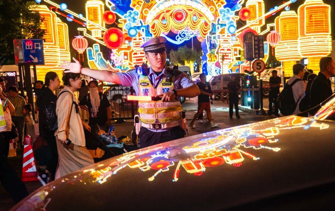 “京彩灯会”近日在北京园博园正式启幕,约4万名游客畅游灯海。针对人流量大等情况,北京丰台警方在灯会9个区域按不同等级梯次投入安保警力,全力为灯会保驾护航。图为交警在灯会周边疏导交通。