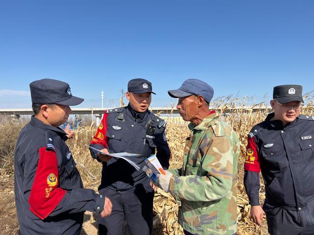 近日,北京铁路公安处怀安站派出所组织民警深入京包客专高铁沿线开展爱路护路宣传和法治教育,提醒沿线居民不要焚烧庄稼秸秆,保管好废弃地膜,以免影响高铁列车运行安全。图为民警向群众发放法治宣传资料。
