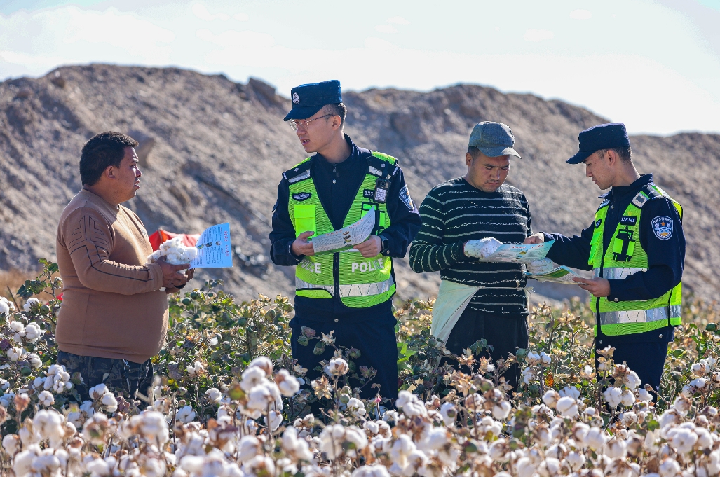 近日,乌鲁木齐铁路公安局喀什公安处在铁路沿线辖区开展“秋收话安全·田间送宣传”主题普法宣传活动,向村民宣传铁路安全知识、反诈常识等,提升群众的反诈、安全意识。图为民警向村民讲解铁路安全知识。