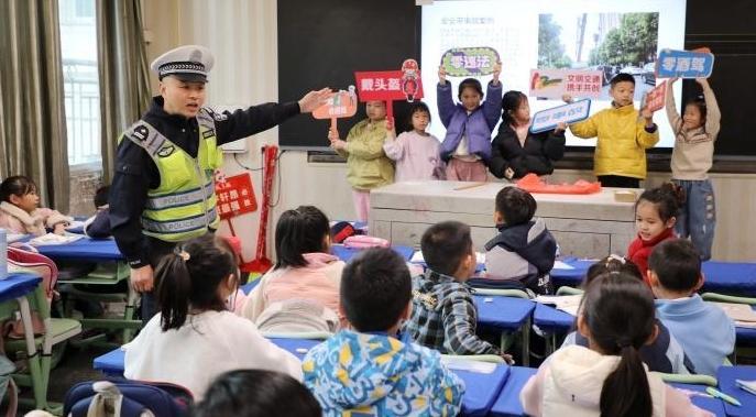 11月20日,江西省九江市公安局交管支队第一大队组织民警到辖区东凤小学开展交通安全宣传活动。图为民警给学生们上交通安全课。