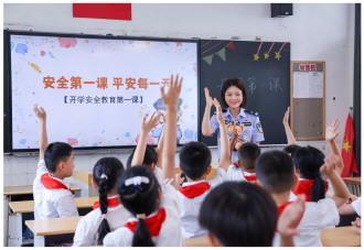 9月1日,开学首日,江苏省常州市公安局钟楼分局北大街派出所组织民警走进觅渡桥小学,开展“开学安全教育第一课”法治宣讲活动。图为民警在课堂上与学生们互动。