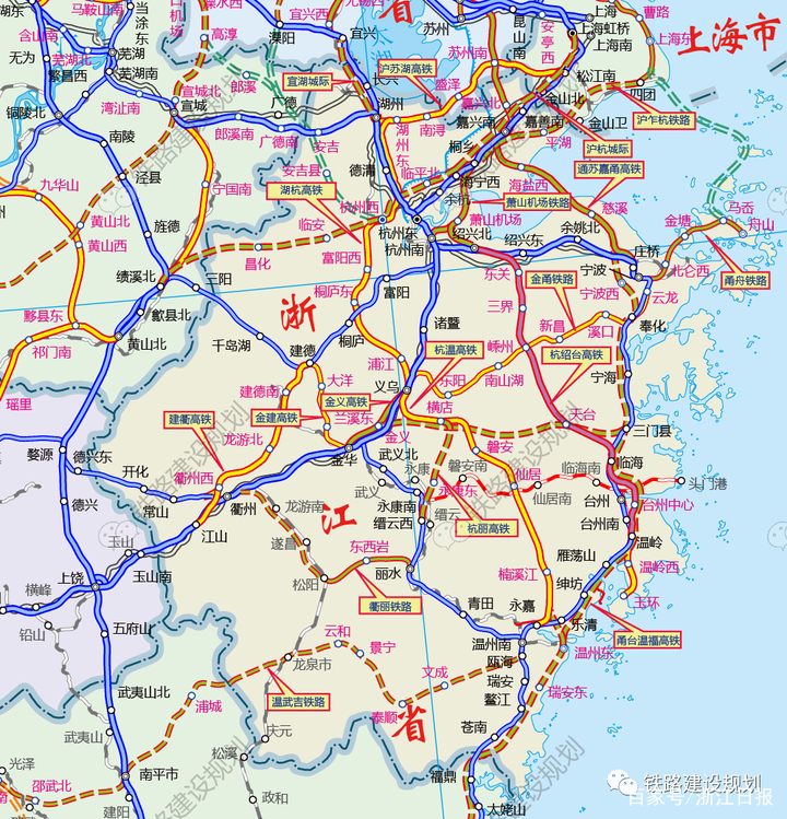 作为交通强国示范区,浙江历来高度重视综合交通发展。新一轮《规划》中,浙江明确要建设枢纽上的城市,其中一个重点,就是要共建长三角国际性综合交通枢纽集群,着力打造杭州国际性综合交通枢纽,加快打造宁波(舟山)国际性综合交通枢纽,温州、金华(义乌)全国性综合交通枢纽和湖州、嘉兴、绍兴、衢州、台州、丽水六大区域性综合交通枢纽。