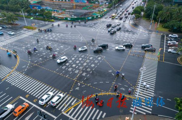2018年12月起,海口公安交警部门根据部分商业片区路口早晚高峰时段非机动车通行需求较大,等待区域蓄车空间不足,非机动车、行人通行滞留等特点,分别在金龙路与玉沙路交叉口、国贸路与玉沙路交叉口两处路口试运行全向过街方式,减少路口非机动车及行人等待过街时间,提高路口通行效率。