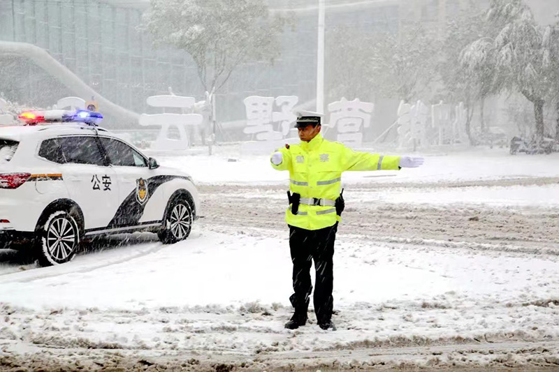 11月7日一早,德州市山东德城区积雪已超15毫米,路面湿滑,给广大市民出行带来很大的安全隐患。德州交警启动应急预案,在辖区重点路段、路口增派警力,疏堵保畅,同时加大巡逻管控力度,帮助“趴窝”车辆解困,快速处理路面刮擦事故,全力确保道路交通安全,被群众称为雪中的荧光“路标”。