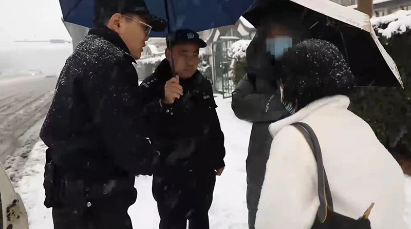图为济南市公安局市中区分局大观园派出所民警帮助贾女士找回雪中乘错车的孩子。