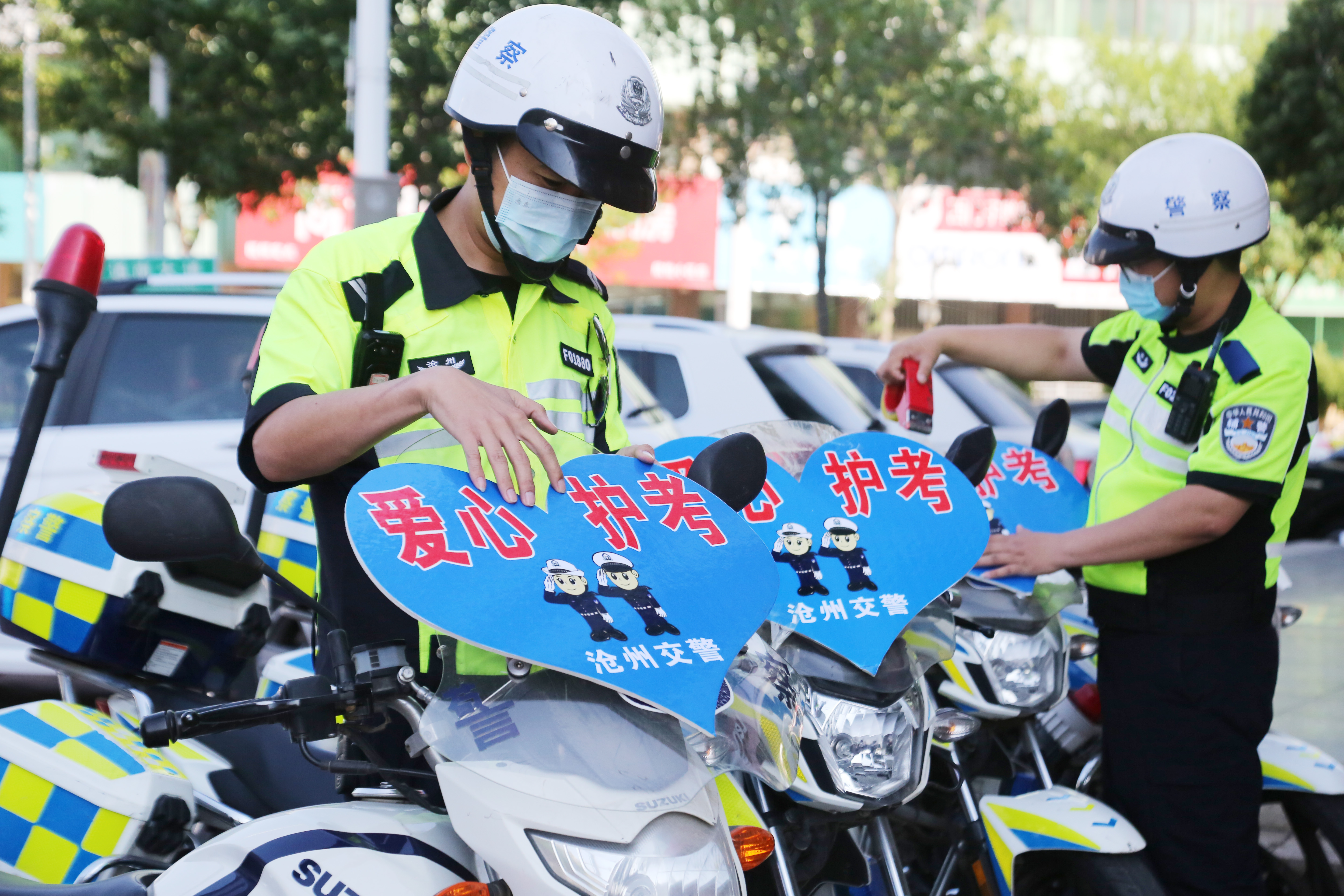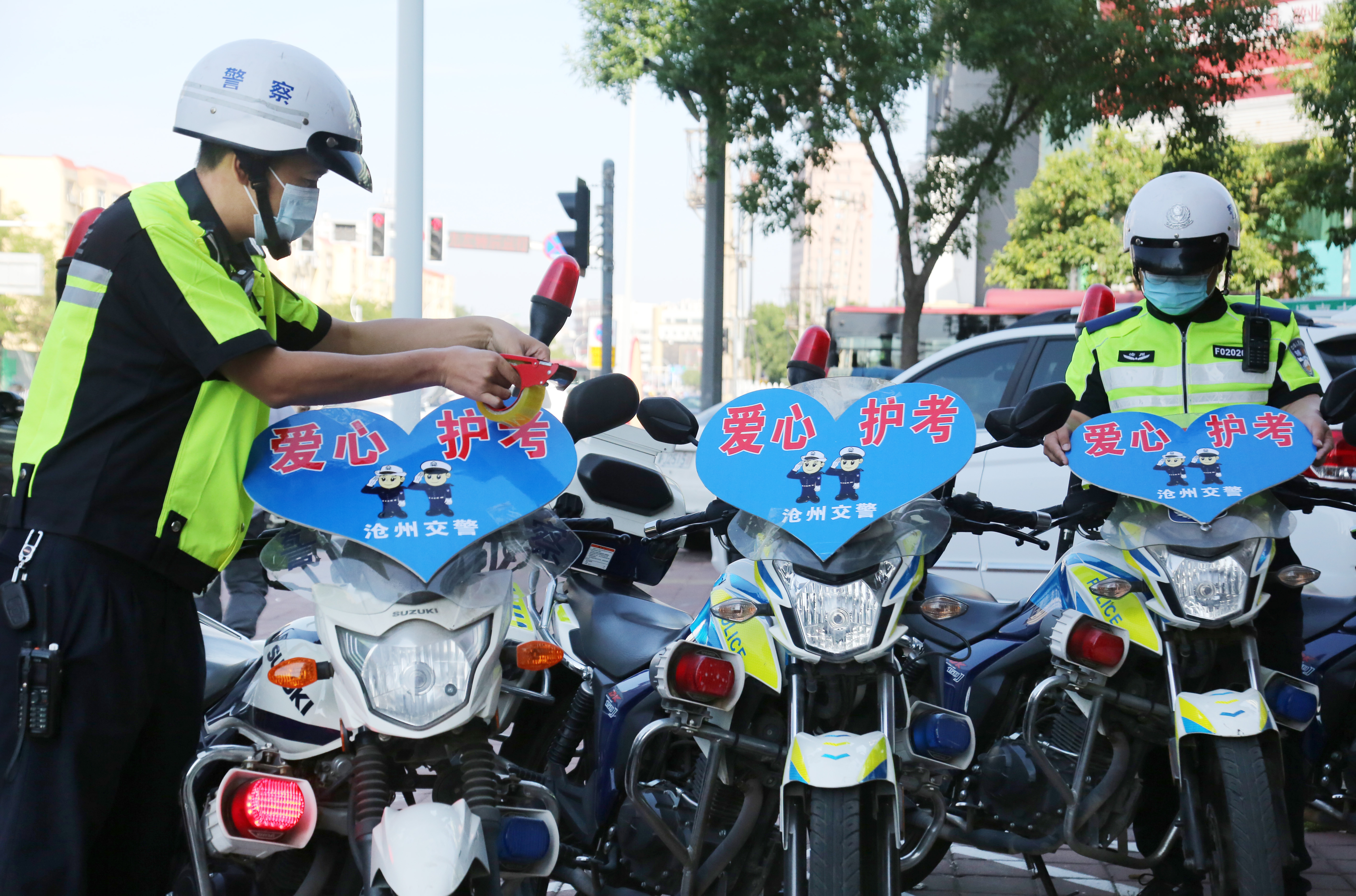 高考在即,河北省沧州市交警提前部署高考护考管控措施,参加维护高考交通秩序和护送考生车辆的执勤交警提前进入高考状态,以良好的精神状态为高考学子和接送考生的车辆“护航”。图为沧州市公安交警支队二大队铁骑交警提前行动,细心检查摩托车机械运行状况、粘贴“爱心护考”标识牌,“备战”高考。
