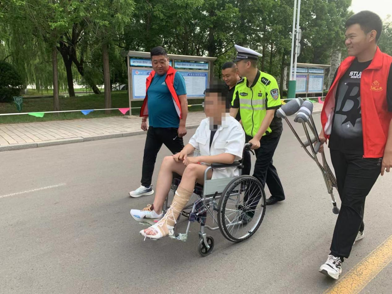 6月7日上午7时10分许,山东省诸城市公安局交警大队民警在诸城一中高考考点执勤时,接到一名考生家长求助称,其儿子在高考前左脚跖骨不慎骨折,打上了厚厚的石膏,导致行动不便。由于考点周边道路实行交通管制以保障高考顺利进行,社会车辆无法通行,所以家长向执勤交警求助。