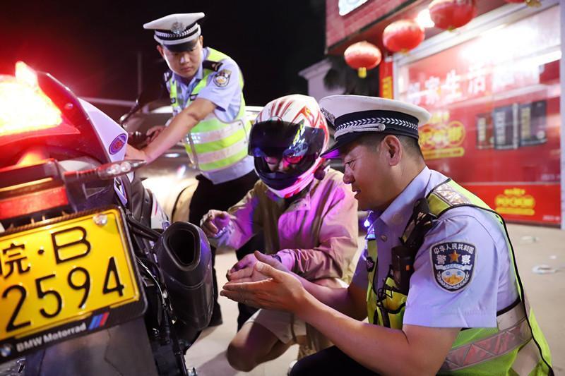 图为6月4日,安徽省芜湖市公安局交警支队鸠江大队民警对一辆违法改装“炸街”摩托车驾驶人进行安全教育,责令其将车辆恢复原状并作出处罚。通讯员 陈效宝 摄