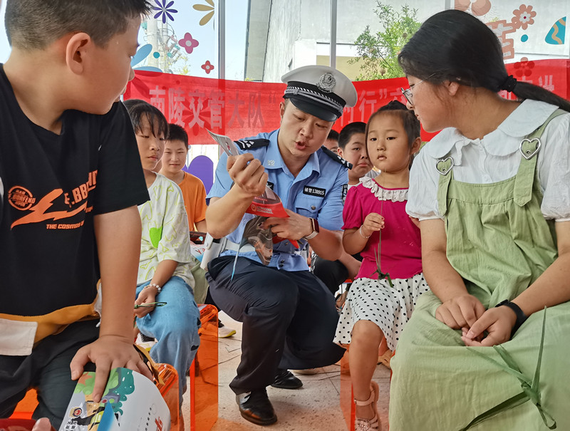 8月15日,安徽省南陵县公安局交管大队民辅警在辖区儿童中开展交通安全宣传活动,增强他们知危险、会避险意识。