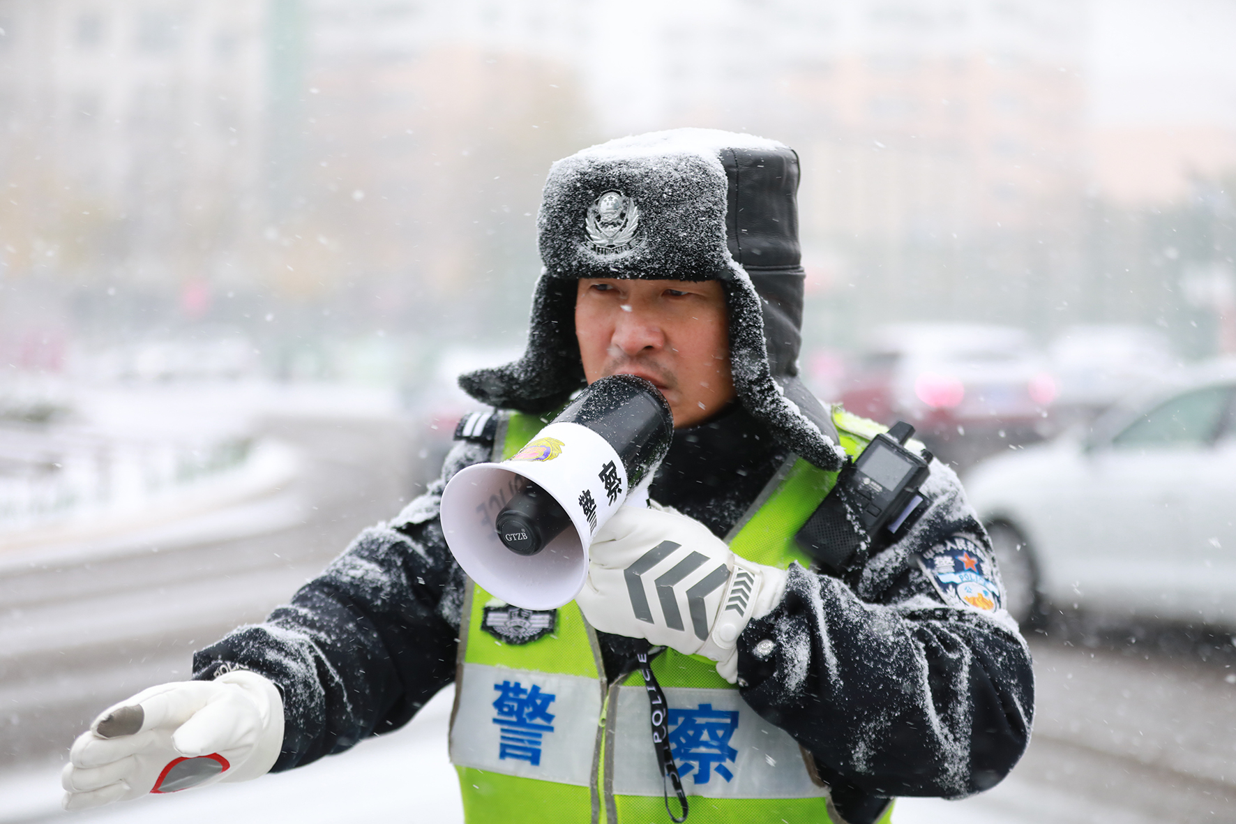 11月6日,辽宁省沈阳市公安局交通警察局以雪为令,对车流行人和坡面路段重点布置警力,确保市民出行安全畅通。