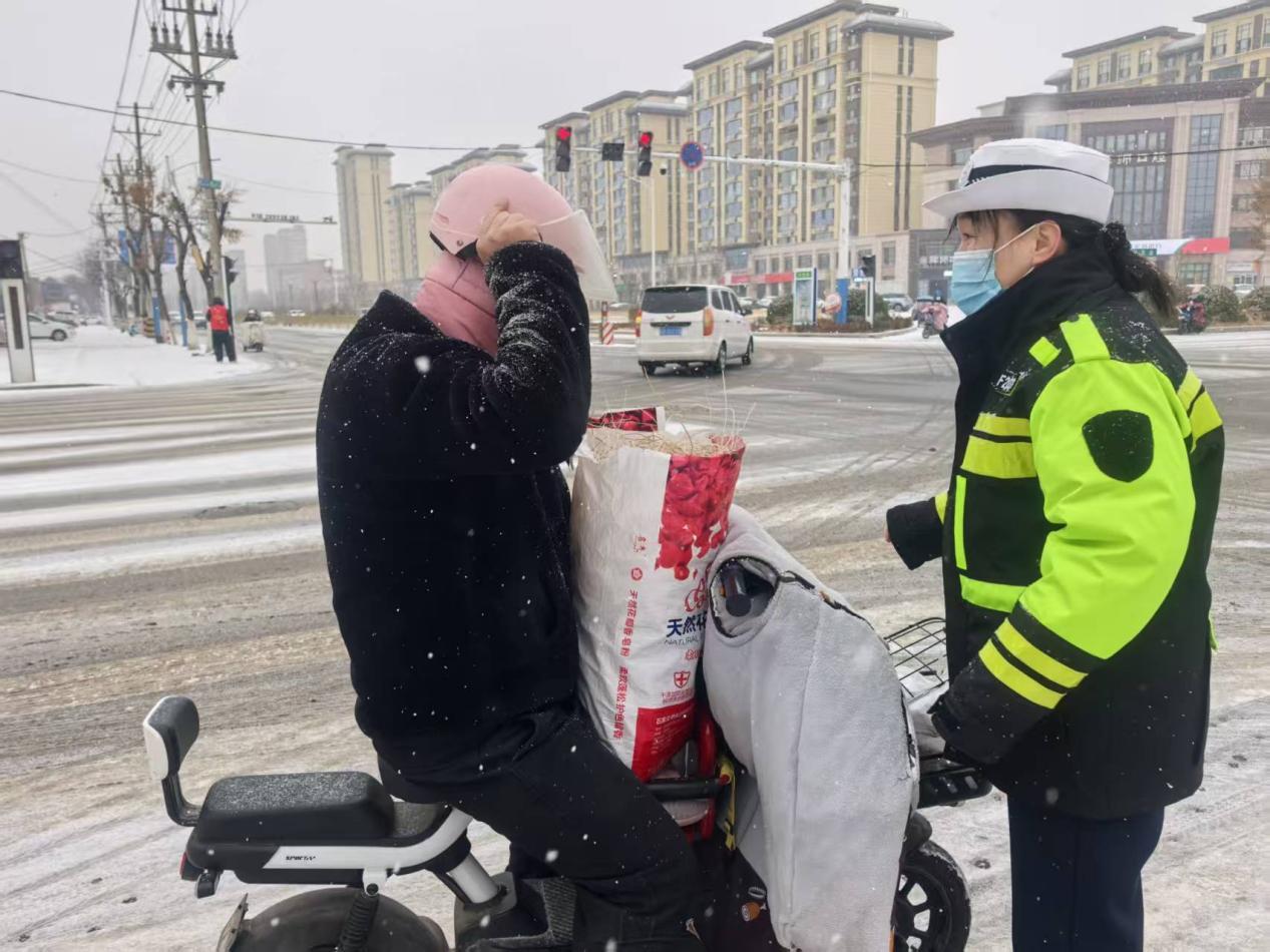 图为菏泽交警在提醒非机动车驾驶员戴好头盔。