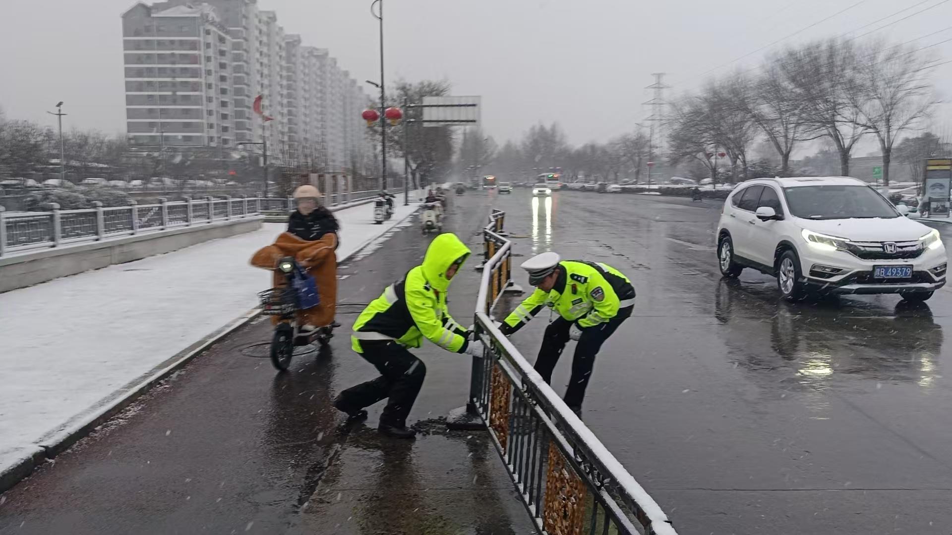 在疏导交通的同时,执勤交警时刻关注路面状况,及时处置各类突发险情。1月29日晚,高速各大队为防止雪后路面、桥面结冰,联合交通运输等部门预防性播撒融雪剂;30日早高峰期间,勤务四大队执勤人员在大南门附近发现因风雪倒地的护栏,迅速合力将其扶正固定,消除了由此可能引发的交通事故隐患;勤务一大队则加强了对辖区国省道、桥梁、涵洞等重点路段的巡逻频次,细致排查积雪、结冰及各类安全隐患,确保不放过一处风险。