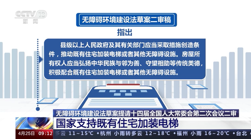 无障碍环境建设法草案提请十四届全国人大常委会第二次会议二审 国家支持既有住宅加装电梯