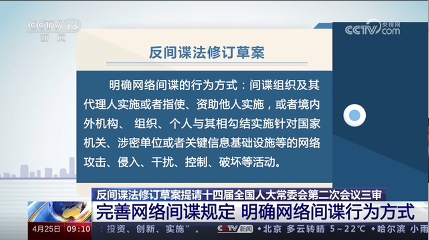 反间谍法修订草案提请十四届全国人大常委会第二次会议三审 完善网络间谍规定 明确网络间谍行为方式