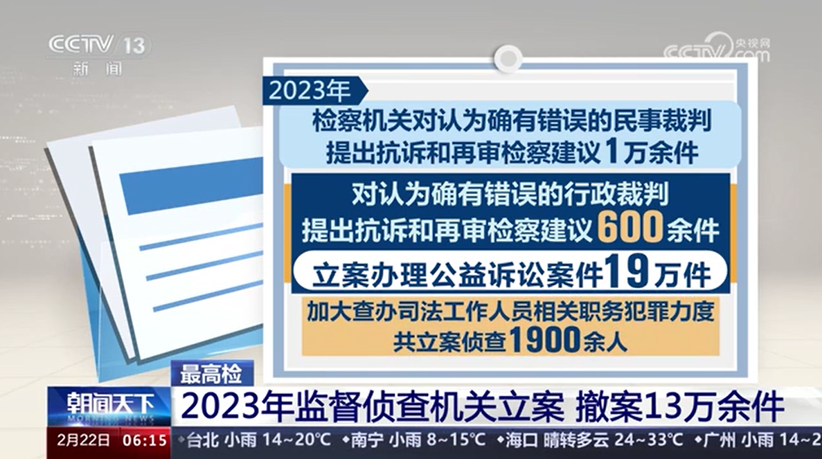 最高检 2023年监督侦查机关立案 撤案13万余件