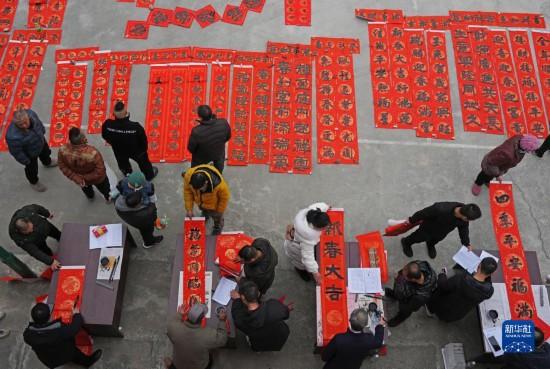 春节临近,多地组织书法志愿者走进社区、工地等场所,为人们书写春联和福字,迎接春节的到来。