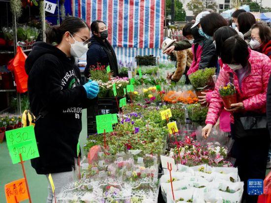 1月16日,在维多利亚公园年宵花市,顾客在花摊前挑选年花。新华社记者 褚萌萌 摄