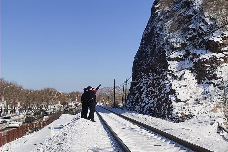大风天承接雨雪天,京承铁路线上,呼啸的寒风吹起地面积雪,雪沫拍打在脸上冰凉刺骨。承德站派出所所长会亚君带领民警来到线路的一处山体旁,“雨雪天开展线路督导检查,要确保线路设备设施运转正常,还要防止周围山体松动,落石影响行车”,会亚君告诉记者,在雪地里踏着石渣行进很慢,一两个小时身上就开始出汗,山风一吹就更冷了。