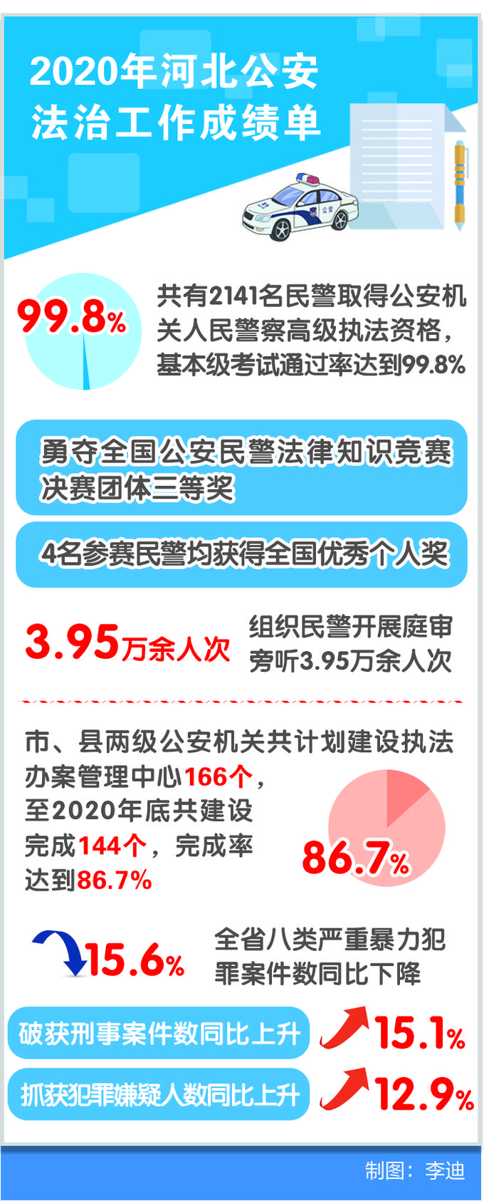据统计,2020年河北市、县两级公安机关共计划建设执法办案管理中心166个,至2020年底共建设完成144个,完成率达86.7%。