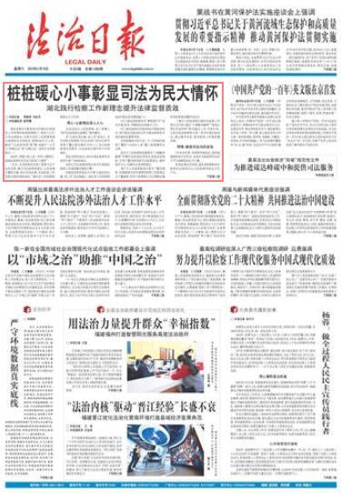 湖北省黄冈市蕲春县刘河镇76岁患病老人李师傅在检察院帮助下,领到了3.2万元司法救助金;宜都市农民工张师傅等通过检察机关支持起诉,领到10余万元工资,解决了长达8年的烦“薪”事;仙桃市一公司从“涉案企业”变“合规企业”,尝到守法经营甜头……