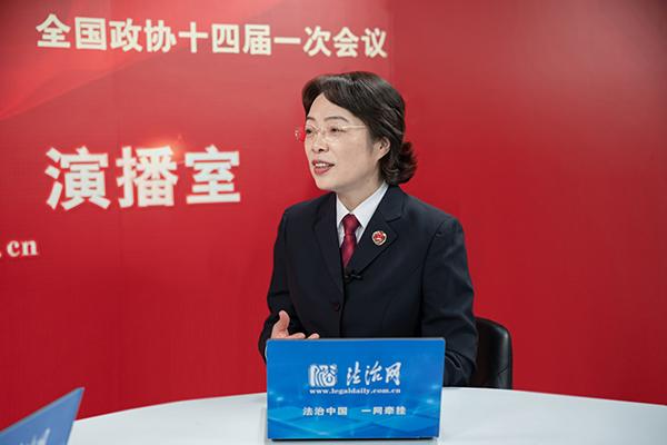 图为全国政协委员、最高人民检察院党组成员、政治部主任潘毅琴在法治网接受采访。 韩毅 摄