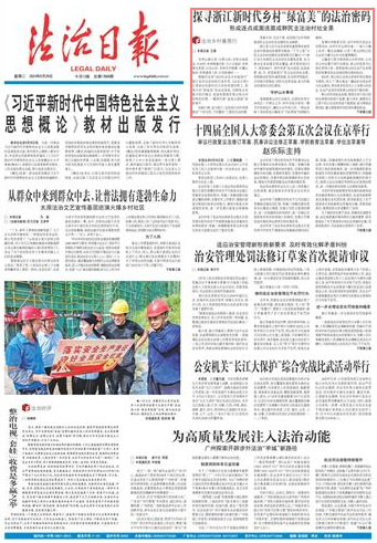余村党支部副书记俞小平说:“我们一直探索用法律维护村民及村庄利益,不断完善村规民约推动良法善治。”