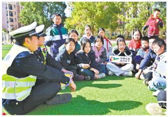 图为江西省武宁县公安局交管大队民警近日走进武宁县第四小学,开展“文明交通 礼行天下”主题宣传活动。 熊遥 摄