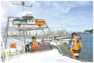 图为海南省三亚市公安局天涯分局三亚港海岸派出所民警近日对三亚港进出港航道进行巡逻防控和疏导。 代龙超 摄