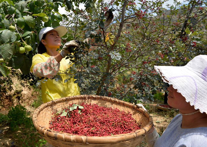 椒农在陇南市武都区马街镇采摘花椒。(新华社发)
