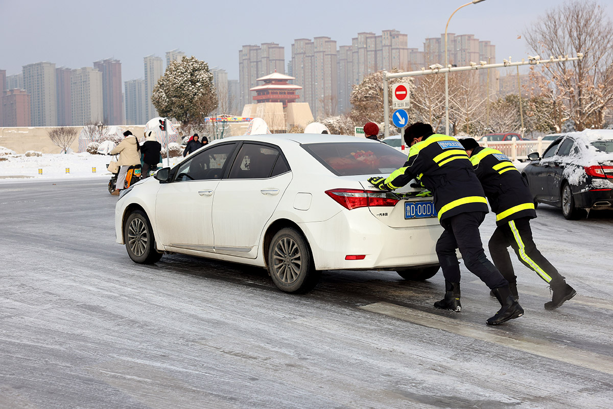 2月5日,山东省枣庄市公安局市中分局交通警察大队民警在道路上帮助推行雪中打滑被困的车辆。近日,受冷空气影响,枣庄市出现雨雪冰冻天气过程。枣庄市公安局市中分局交通警察大队启动恶劣天气应急管理预案,全员上岗,保障市民出行平安。