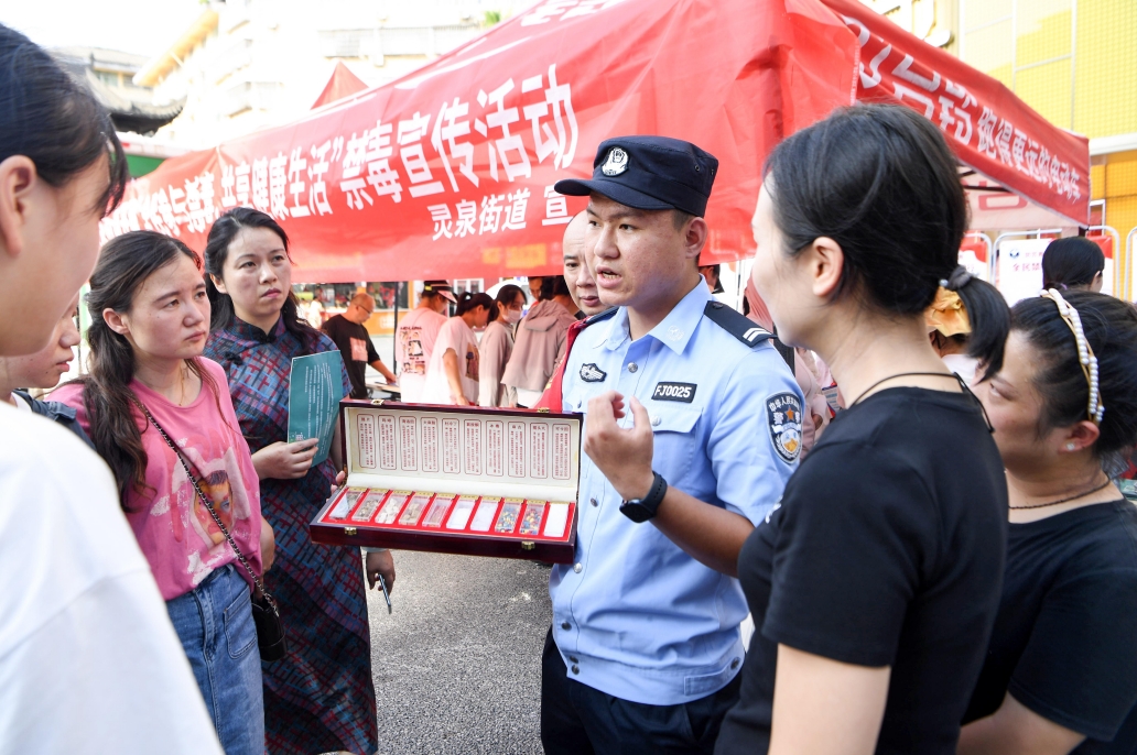 近日,江西省宜春市袁州区灵泉街道联合灵泉派出所在鼓楼广场开展“全民参与禁毒、共享健康生活”禁毒宣传活动,通过展示毒品模型、以案释法、现场答疑等方式,全面提升人民群众识毒、防毒、拒毒意识,营造全民禁毒浓厚氛围。
