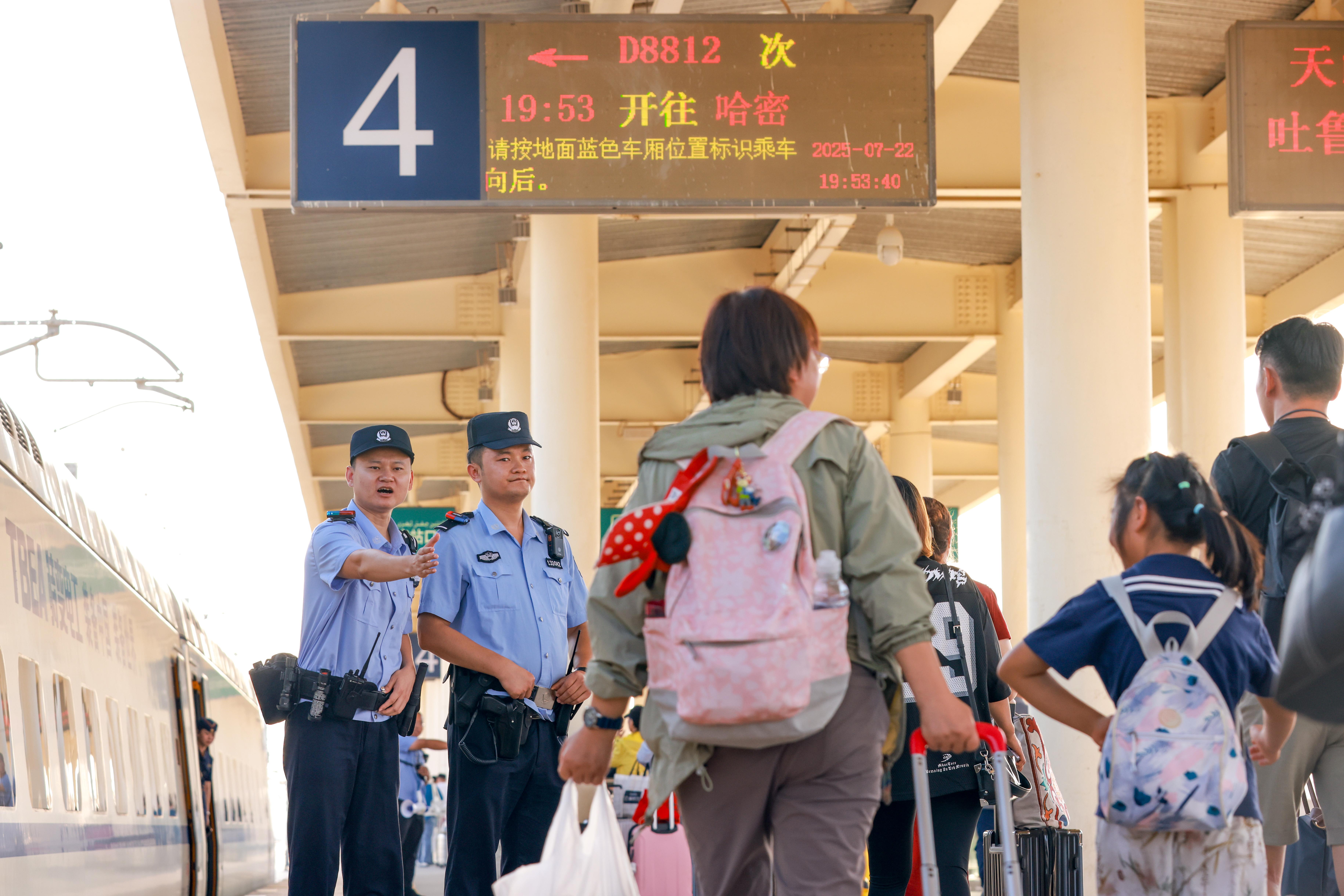 连日来,新疆吐鲁番持续高温,平均气温达43℃,最高突破47℃。在灼人热浪中,乌鲁木齐铁路公安局哈密公安处吐鲁番北站派出所民警以滚烫热情,为旅客撑起平安清凉。为应对“炙烤”考验,执勤民警加大巡查力度,在站台维护旅客乘降秩序,在候车室为旅客答疑解惑,提醒安全乘车,在检票口提示旅客出行时避免遗落行李物品等,助力旅客平安出行。