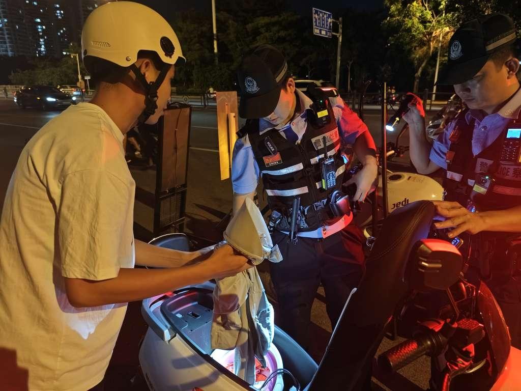 三亚市公安局交管支队以主城区为中心点,围绕道路交通安全,严查电动车未佩戴安全头盔、飙车炸街、酒驾醉驾、无证驾驶等交通违法行为,形成有力震慑。针对夏季夜间酒后驾驶违法行为多发时间、区域和主要路段,灵活设置临时检查点,采取“定点查处+流动执法”等方式,切实形成严防、严控、严打态势。同时,广泛开展交通安全宣传,以群众“看得见、容易懂、记得住”的方式,有针对性地开展宣传教育,切实提升群众安全防范意识。