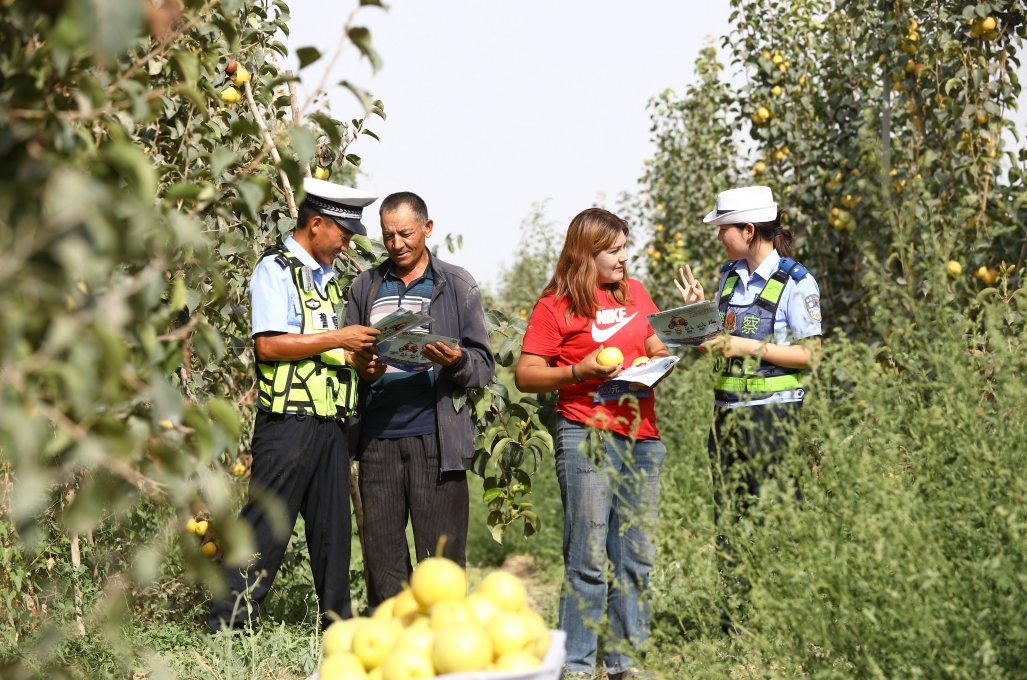 8月12日,新疆喀什地区叶城县公安局组织民警深入辖区梨园,推行“助农+普法”工作模式,协助果农采摘果实,并在劳作休息时间,面对面开展普法宣传,用实际行动守护果农的劳动成果。