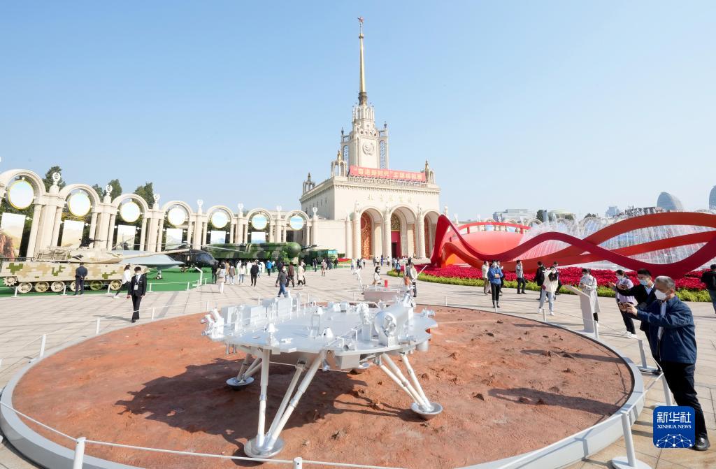 10月7日,观众在“奋进新时代”主题成就展上体验操纵直升机训练模拟器。