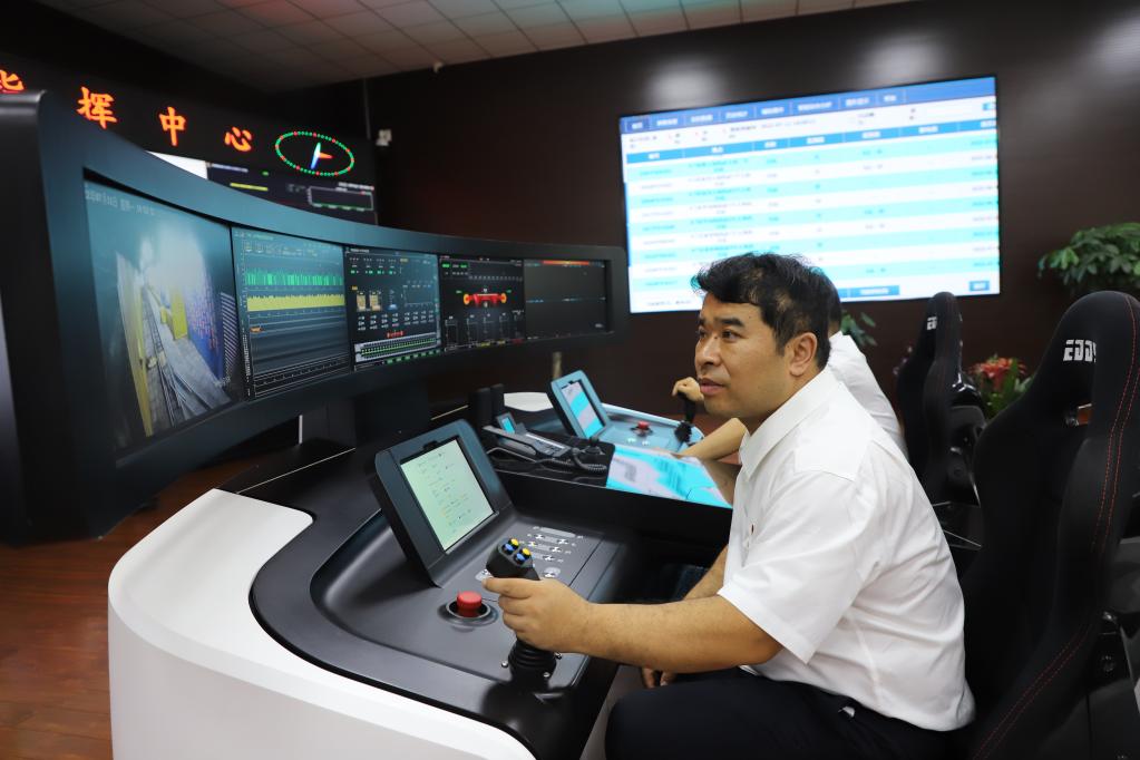 李杰在“太空舱”式综采智能化控制系统前远程操控井下设备。