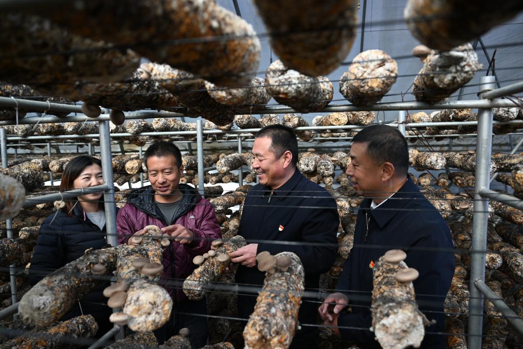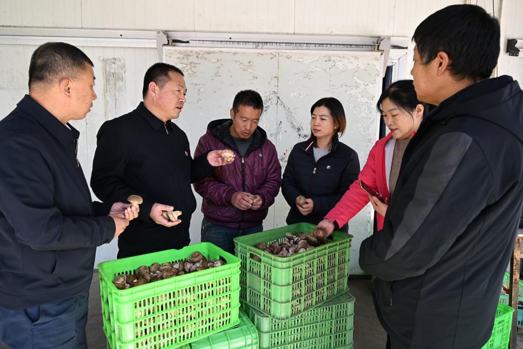 顾瑞利(右二)从北京返回村后到食用菌大棚了解香菇长势。