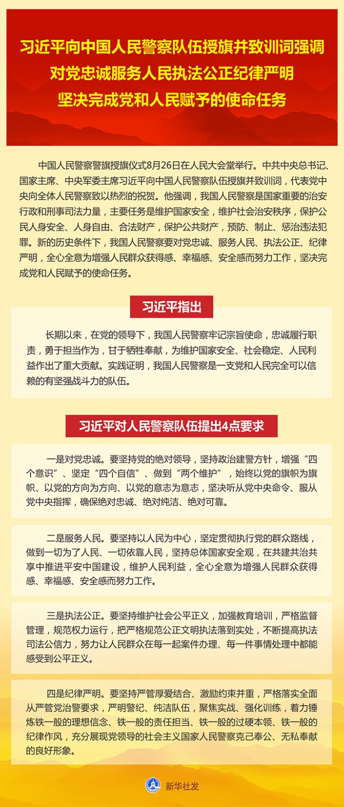 新华社北京8月26日电 中国人民警察警旗授旗仪式26日在人民大会堂举行。中共中央总书记、国家主席、中央军委主席习近平向中国人民警察队伍授旗并致训词,代表党中央向全体人民警察致以热烈的祝贺。他强调,我国人民警察是国家重要的治安行政和刑事司法力量,主要任务是维护国家安全,维护社会治安秩序,保护公民人身安全、人身自由、合法财产,保护公共财产,预防、制止、惩治违法犯罪。新的历史条件下,我国人民警察要对党忠诚、服务人民、执法公正、纪律严明,全心全意为增强人民群众获得感、幸福感、安全感而努力工作,坚决完成党和人民赋予的使命任务。