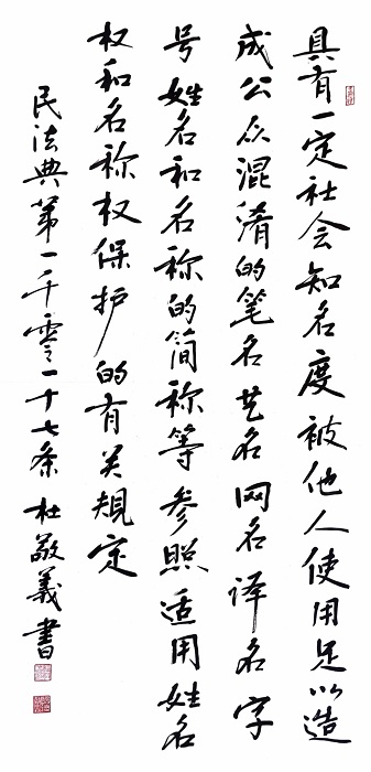 民法典第一千零一十七条 具有一定社会知名度,被他人使用足以造成公众混淆的笔名、艺名、网名、译名、字号、姓名和名称的简称等,参照适用姓名权和名称权保护的有关规定。